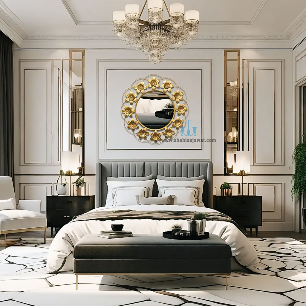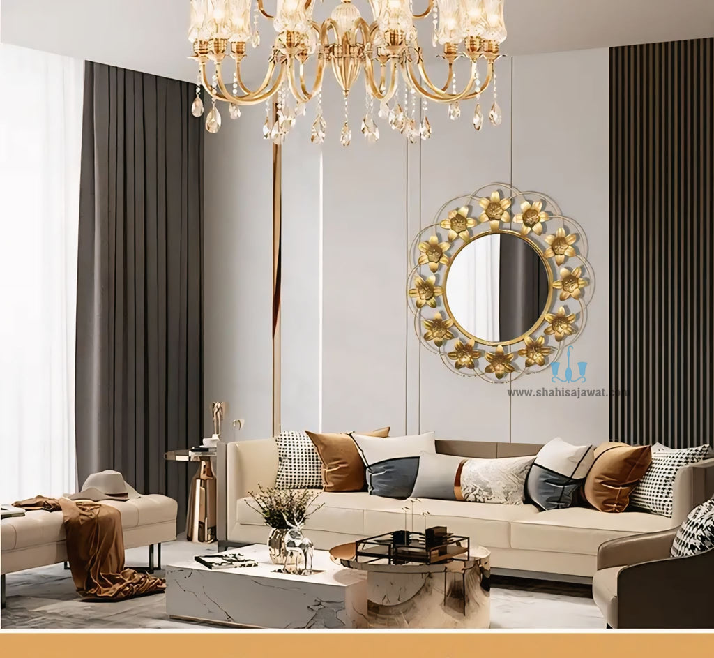 Design: Beautiful Gold Florets Encircling The Simple Round Wall Mirror.