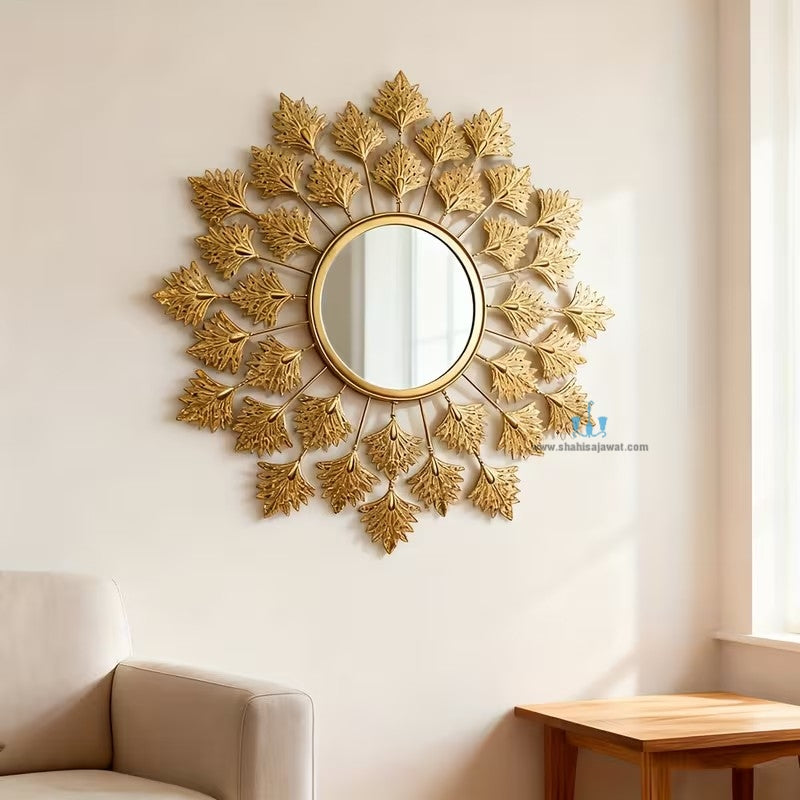 Design: Magnificent Gold Mirror Is Round In Shape And Has 2 Layers Of Neatly Arranged Leaves On All Sides Of The Mirrors.